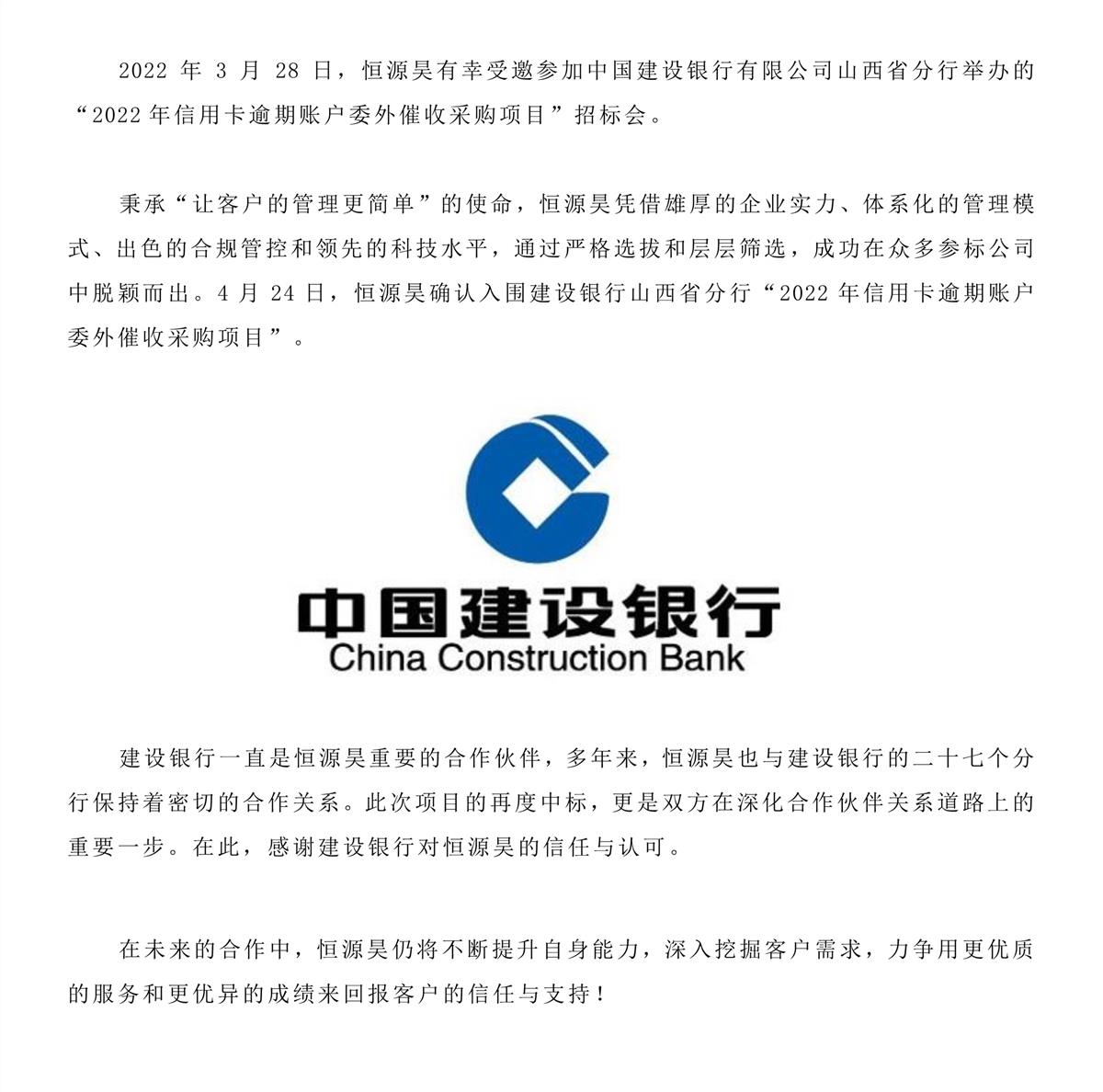 喜報(bào)!恒源昊中標(biāo)建設(shè)銀行山西省分行“2022年信用卡逾期賬戶委外催收采購項(xiàng)目”